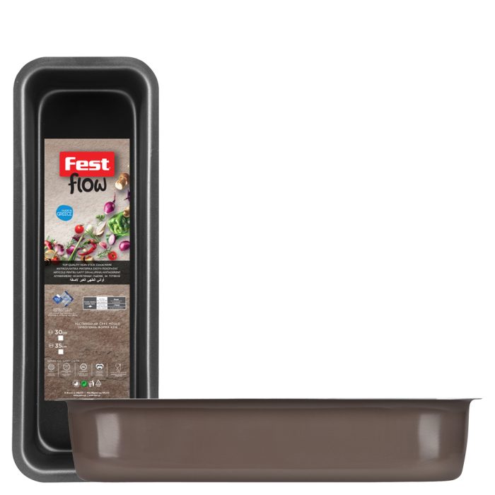Η Αντικολλητική Ορθογώνια Φόρμα Νο35 της νέας σειράς αντικολλητικών σκευών Flow της Fest ήρθε για να κάνει τη μαγειρική απόλαυση! Η αντικολλητική επικάλυψη TEFLON με την εγγύηση ποιότητας της Chemours σας προσφέρει, εύκολο, γρήγορο και υγιεινό μαγείρεμα!