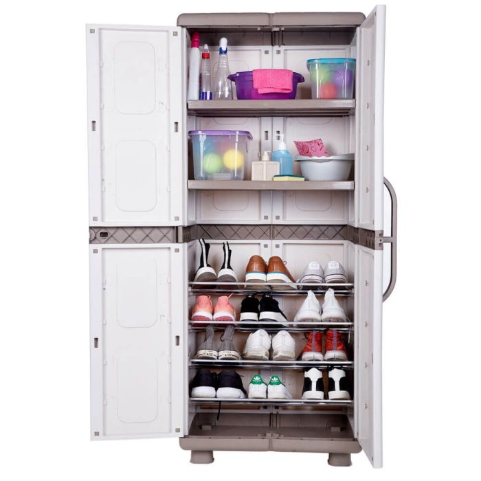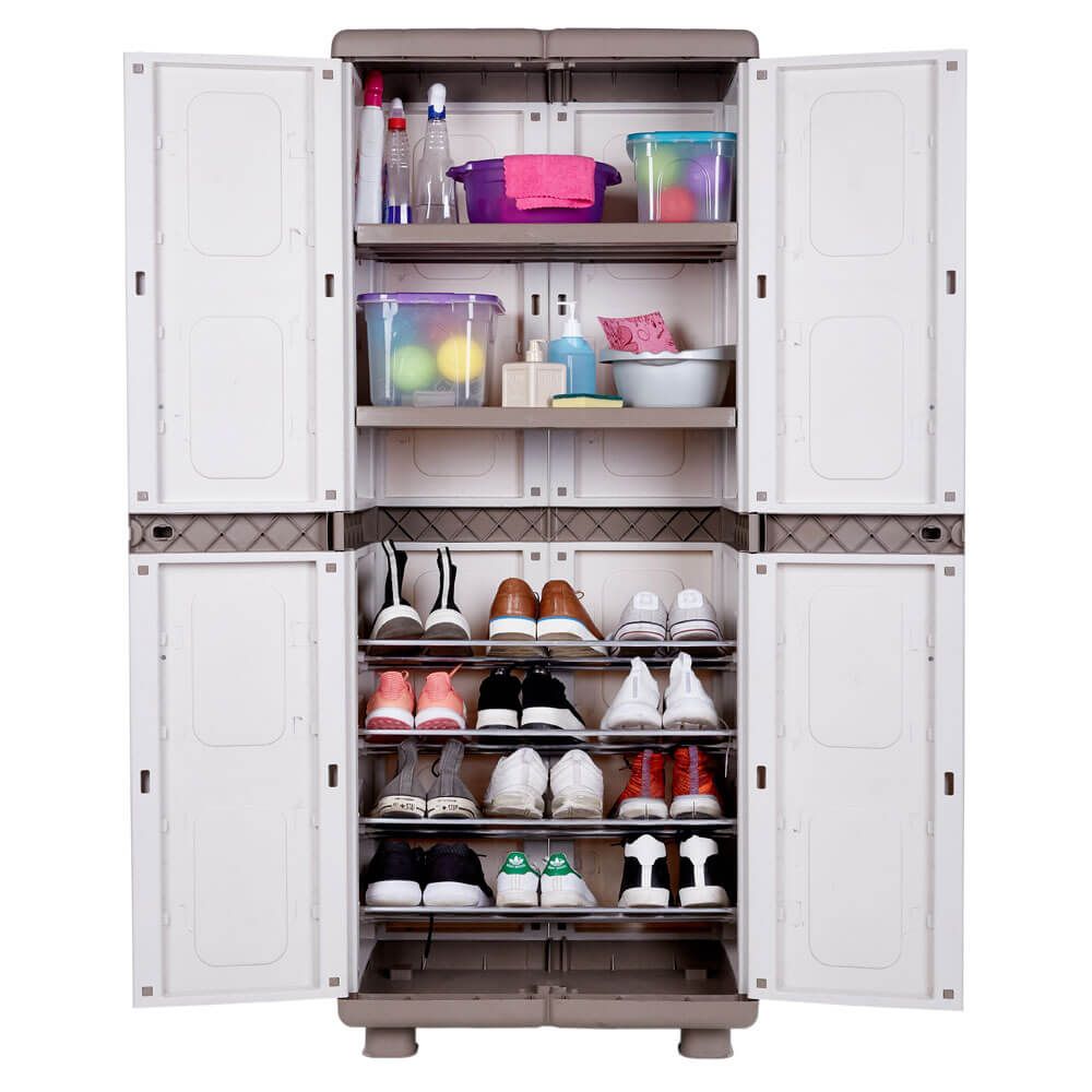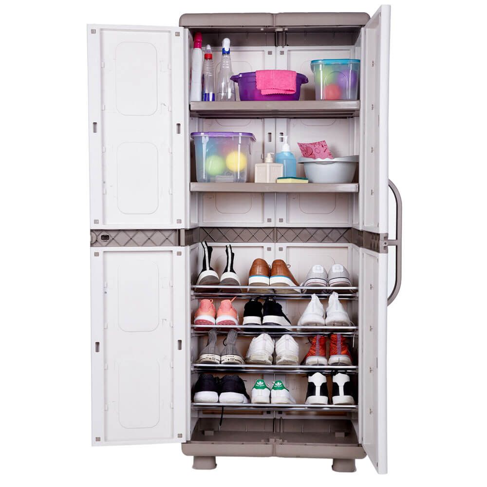Αποτελείται από 2 πόρτες, 2 ράφια με αντοχή βάρους έως 25kg και 4 ράγες για παπούτσια. Η εύκολη συναρμολόγηση παράλληλα με την ανθεκτική της κατασκευή στις καιρικές συνθήκες την καθιστούν ως μια ιδανική λύση για το μπαλκόνι σας ή το γκαράζ.